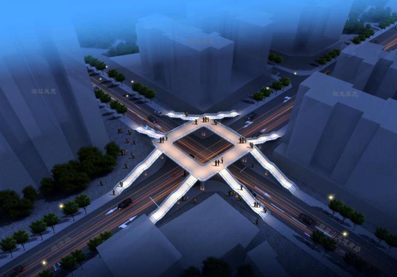 酉陽縣過街人行天橋(一期)項目:(1)鐘多小學人行天橋采用“菱”形平面布置,天橋主梁寬度4.2m,凈寬4.0m;梯道寬2.5m,凈寬2.3m;在梯道兩級休息平臺均設置梯道墩,梯道下設置管理用房;(2)民族小學人行天橋:天橋采用“H”形平面布置,天橋主梁寬度4.2m,凈寬4.0m;梯道寬2.6m,凈寬2.4m;在梯道兩級休息平臺均設置梯道墩,梯道下設置管理用房;(3)酉州小學人行天橋:天橋采用“工字型”天橋全長13.1m,橋面橫向全寬3.2m,凈寬3.0m;梯道寬2.0m,凈寬1.8m,每18級臺階設置休息平臺。本工程于2018年10月19日開工建設,2019年10月16日完成全部工程建設。