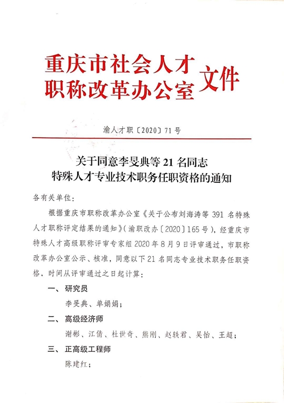 (9月15日 張渝涵訊)近日,酉州實(shí)業(yè)集團(tuán)工程部部長陳建紅獲得重慶市職稱改革辦公室評(píng)定的正高級(jí)工程師任職資格。